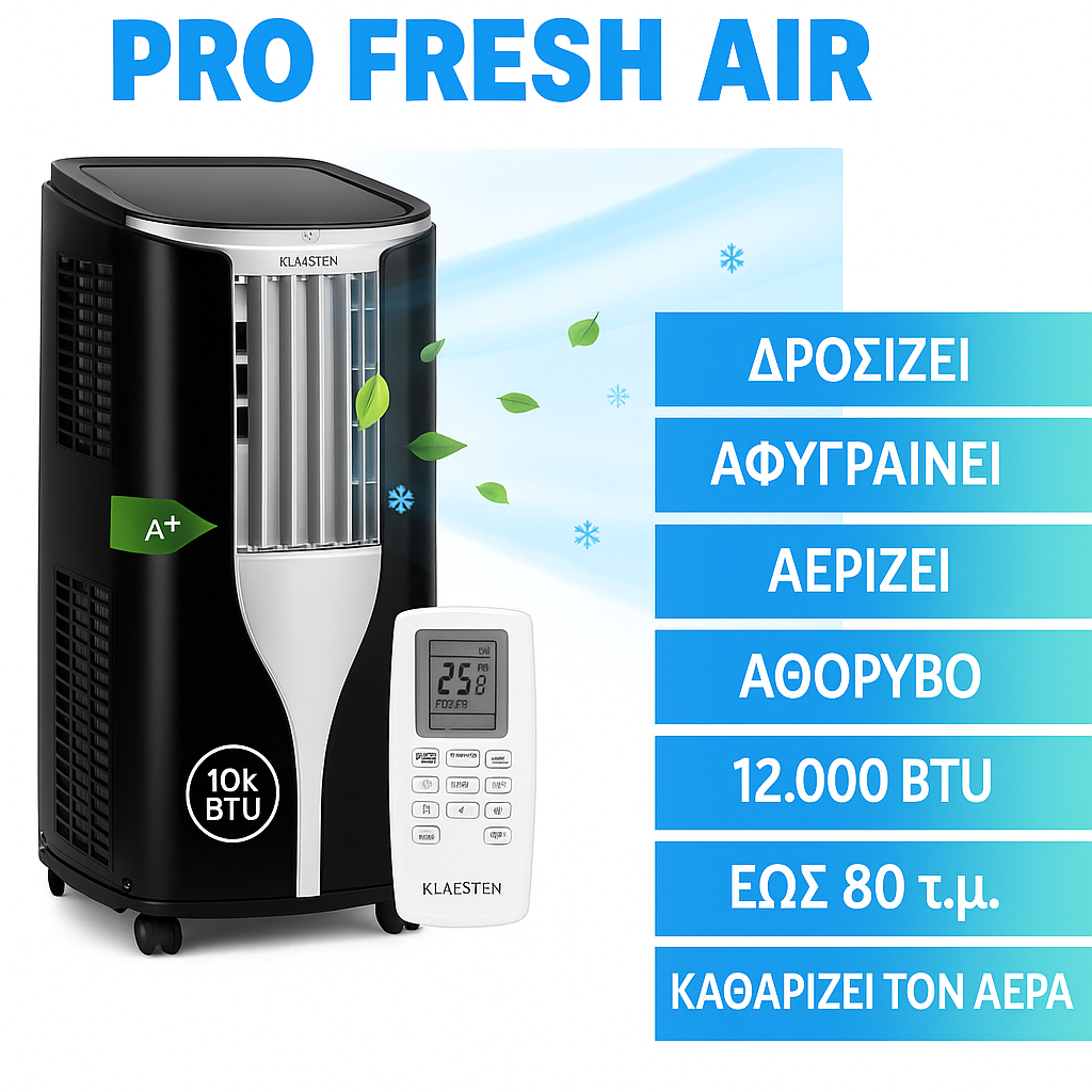 Κλιματιστικό, Αφυγραντήρας, Ανεμιστήρας και Καθαριστής αέρα. Χωρίς σωλήνα αποχέτευσης. Δεξαμενή 19 λίτρων. Ισχύς 12.000 BTU σαν ένα σταθερό κλιματιστικό. Πλενόμενο φίλτρο HEPA αντιαλλεργικό. Αισθητήρας θερμοκρασίας και λειτουργία νυχτερινής κατάστασης που αποφεύγουν την άσκοπη κατανάλωση ρεύματος